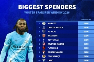 冬窗引援花费排行:曼城9500万欧居首,迈阿密国际3500万欧第11