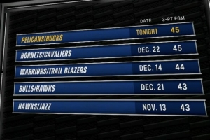 本场比赛雄鹿三分47中21,鹈鹕46中24,双方合计命中45记三分,平本赛季单场最多。