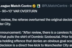 裁判现场宣布:经视频回放确认,哈兰德有一次鲁莽犯规,拉拽了索博斯洛伊的球衣。在这之前,索博斯洛伊也有一次拉人犯规,破坏了一次明显的得分机会。最终判罚曼城获得直接任意球,并向索博斯洛伊出示红牌。