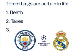 官方玩梗!曼城官推:人生三大确定之事,死亡、税收、欧冠vs皇马