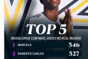 维尼修斯追平卡塞米罗,成为皇马队史出战比赛第3多的巴西球员,位居他身前的是马塞洛(546场)以及卡洛斯(527场),罗德里戈以281场位居第5。