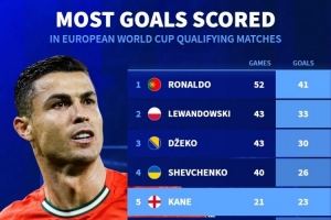 体育资讯11月17日讯 德国转会市场列出了欧洲世预赛历史射手榜,C罗41球居首,莱万33球次席,哈兰德21球排在第7位。