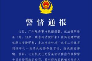 近日,广州越秀警方根据报警,依法查明徐某(男,31岁,跳水运动爱好者)在其创建的微信群内变换昵称,多次发表针对广东省二沙体育训练中心一运动员的侮辱性言论,造成恶劣影响。目前,公安机关已对徐某依法作出行政拘留十日并处罚款的处罚,并对群内其他相关行为人员依法作出处理。