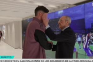 在与巴尔韦德握手时,弗洛伦蒂诺轻轻给了巴尔韦德一巴掌,而在碰到贝林厄姆时则与其交流了几句。