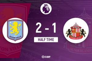 体育资讯4月19日讯 北京时间4月19日21:00,25/26赛季英超联赛第33轮,阿斯顿维拉坐镇主场维拉公园球场,对阵黑猫桑德兰。上半场沃特金斯开场2分钟进球帮助维拉领先,并在第36分钟完成双响,桑德兰在第9分钟由里格打入一球。半场结束,阿斯顿维拉暂时2-1桑德兰。