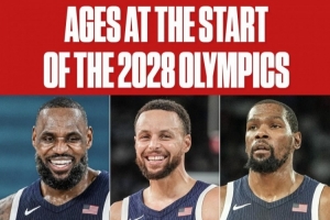 如果届时库里、詹姆斯、甚至是杜兰特参加洛杉矶奥运会,他们三人的年龄将分别是43岁、40岁和39岁。