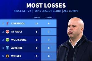 体育资讯11月24日讯 德转统计了自9月27日以来五大联赛球队的输球榜,利物浦以8场比赛高居榜单第一位。