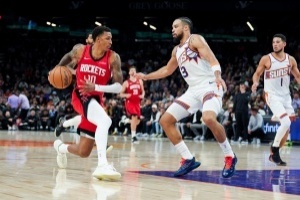 体育资讯11月25日讯 火箭114-92太阳,赛后,火箭球员小贾巴里·史密斯接受媒体采访。