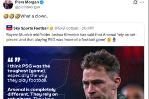 称阿森纳依赖定位球+爱打长传,摩根炮轰基米希:真是个小丑
