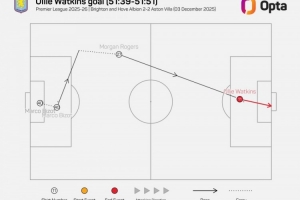体育资讯12月4日讯 维拉在本轮英超对阵布莱顿,罗杰斯助攻沃特金斯破门。