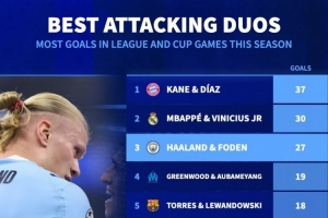 体育资讯12月5日讯 德国转会市场统计了本赛季五大联赛进攻端双人组在联赛和杯赛中的进球数量,并列出榜单,凯恩+迪亚斯37球居首,姆巴佩+维尼修斯30球次席。