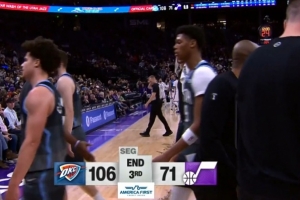 前三节比赛,场上完全呈现出一边倒的局面,爵士三节过后已经让雷霆得分破百并落后多达35分,更为可怕的是,爵士三节拿到71分比雷霆半场结束时的74分还少3分。