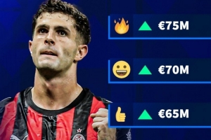 德国转会市场预热普利西奇的身价变化,最高可能达到7500万欧元,最低保持6000万欧元。