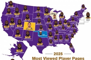 BBR晒2023年各州被浏览次数最多球员:詹姆斯在41个州处于领先地位