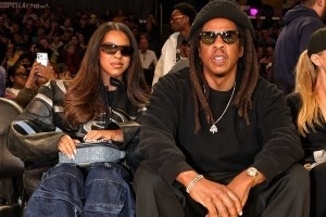 今日,美国著名说唱歌手JAY-Z带女儿BLUE来到场边观战湖人。