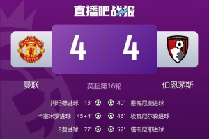 下一篇: 曼联4-4战平伯恩茅斯,为球队自2013年以来英超最高比分平局
