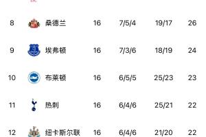 英超第16轮战罢,前三强与后面的球队拉开分差。英超从第5(水晶宫)到第15(布伦特福德)之间,仅相差6分。其中第5水晶宫、第6曼联、第7利物浦、第8桑德兰同积26分。