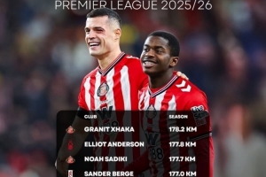 3、诺亚·萨迪基(桑德兰),177.7公里