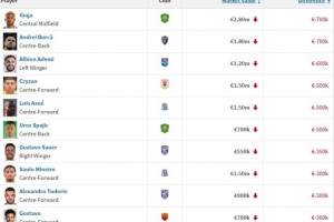 中超身价下降榜:古加、布尔克跌70万欧居首,国安申花三镇各2人