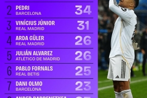 体育资讯12月17日讯 西甲运动战创造机会排行榜出炉,姆巴佩47次高居第一,佩德里、维尼修斯紧随其后。