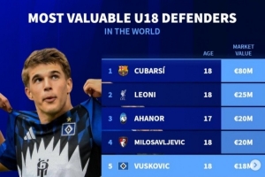 德转列U18后卫身价榜:库巴西8000万断崖领跑,莱奥尼2500万第二
