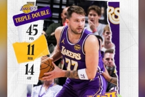 本场比赛,东契奇火力全开,出战39分33秒,28投14中,三分12中4,罚球16中13,狂砍45分11篮板14助攻5抢断大号三双,仅出现1次失误。