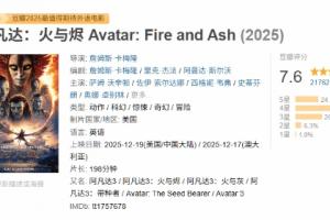 体育资讯12月19日讯 备受影迷期待的卡梅隆新电影《阿凡达:火与烬》(《阿凡达3》)已于今日正式上映!截止至发稿时,本作的豆瓣评分已正式出炉,获得了7.6分的评价!