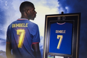 体育资讯12月20日讯 据法国足协官方在线商店显示,为庆祝登贝莱荣获2025年金球奖,官方推出了一款极其珍贵的联名收藏品,带有独家金色印字的登贝莱装裱球衣。