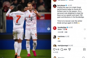 凯恩写道:“以一场胜利收官这一年!今天的出色表现为本赛季的精彩开局画上了圆满句号。尤其令我欣喜的是,能以队长身份带领队友出战,并达成了个人在德甲联赛中参与100粒进球的里程碑。”