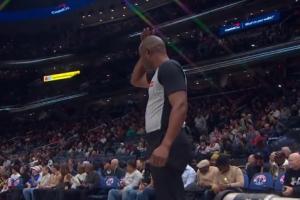 GIF-文班跳球时肘到裁判脑袋 裁判问题不大继续执裁比赛