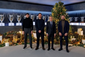 体育资讯12月25日讯 今日是西方传统节日圣诞节,皇马官方社媒晒出皇马主席弗洛伦蒂诺、主帅阿隆索和两大队长巴尔韦德、卡瓦哈尔的合照。