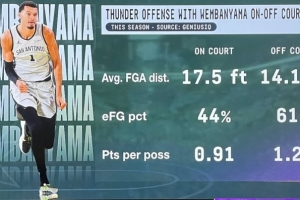 文班在场时,雷霆的平均出手距离是17.5英尺(约5.3米)、而他不在场时出手距离平均是14.1英尺(约4.3米)。文班在场时,雷霆的有效命中率仅为44%,他不在场时是61%。文班在场时,雷霆每回合得分为0.91分,他不在场时是1.24分。