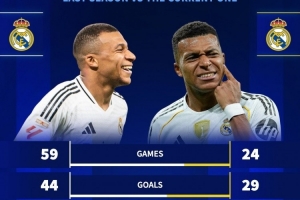 体育资讯12月27日讯 德国转会市场统计了姆巴佩上赛季、本赛季的数据,并做出对比。