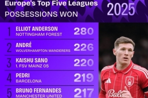 体育资讯12月31日讯 2025年即将结束,数据机构squawka也统计了本年度五大联赛夺回球权情况,诺丁汉森林中场埃利奥特·安德森独自领跑。
