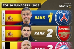 体育资讯12月31日讯 2025年世界足坛年终盘点,Score90评选出2025年年度最佳主帅,其中恩里克实至名归排名榜首,阿森纳主帅阿尔特塔排名第2。