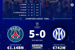 欧冠决赛:巴黎5-0国米