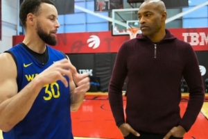 体育资讯1月7日讯 近日,勇士球星斯蒂芬·库里在训练中和文斯·卡特聊天。