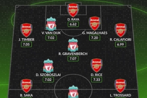 体育资讯1月8日讯 本轮英超将迎来焦点战利物浦对阵阿森纳,数据网站Whoscored也盘点了两支球队本赛季英超评分最高阵容,枪手7人在列。具体如下: