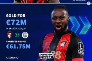 伯恩茅斯近年盈利:塞梅尼奥+6175万,索兰克、赫伊森均超4千万