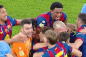 赛后,巴塞罗那球员拥抱在一起激情庆祝。