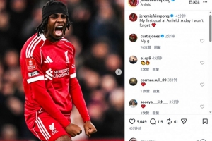 弗林蓬社媒晒出庆祝进球的照片,配文:“我在安菲尔德的首粒进球,我永远不会忘记的一天。”