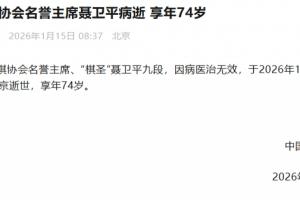 中国围棋协会名誉主席、“棋圣”聂卫平九段,因病医治无效,于2026年1月14日22时55分在北京逝世,享年74岁。