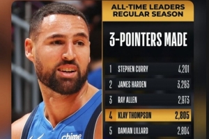克莱的生涯三分球命中数超越利拉德,上升至NBA历史第四位;今天,库里转发评论道:“耶,杀手!”