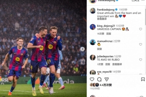 德容社媒晒出与莱万庆祝进球的合照,配文:“球队展现了很棒的态度,收获一场重要的胜利。”