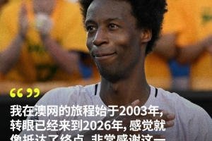 赛后,孟菲尔斯说道:“我在澳网的旅程始于2003年,转眼已经来到2026年,感觉就像抵达了终点。非常感谢这一路精彩的旅程,太不可思议了。”