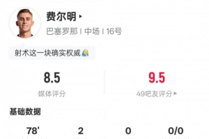 体育资讯1月22日讯 欧冠联赛阶段第7轮,巴萨客战布拉格斯拉维亚,费尔明首发出战,贡献双响,还有1次关键传球,4次抢断,评分8.5。