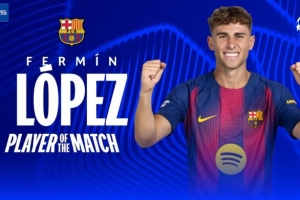 体育资讯1月22日讯 欧冠联赛阶段第7轮,巴塞罗那客场4-2战胜布拉格斯拉维亚,赛后,费尔明被评为全场最佳球员。
