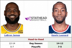生涯至今,詹姆斯常规赛面对伦纳德12胜14负,季后赛5胜7负。