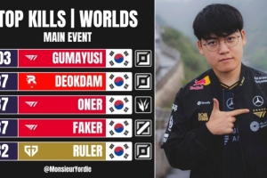 Gumayusi以103排名本届世界赛第一位,deokdam、Oner、Faker均以87杀并列第二。