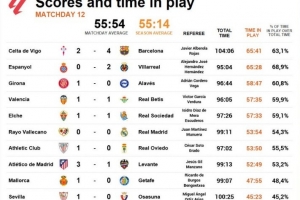 体育资讯11月10日讯 数据网站OPTA盘点了本轮西甲有效时间榜单,其中巴萨4-2塞尔塔以及比利亚雷亚尔2-0西班牙人的两场比赛有效时间超过65分钟。